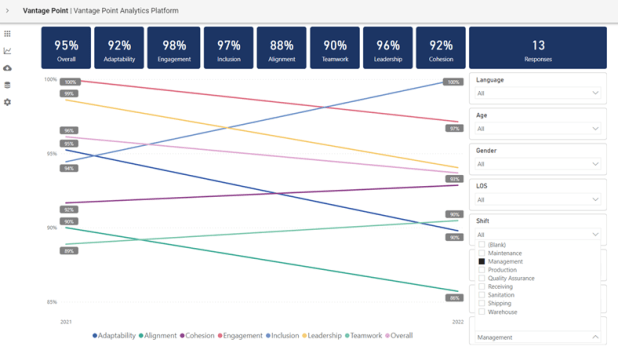 1. Can you drill down in the results? Can you look at results by multiple demographics, including department, gender, length of service, etc.? For example, as long as there are sufficient numbers to maintain confidentiality of the respondents, can you look at the results of female second shift millennial Hispanic production workers? Do you have to use demographics defined by the survey company, or can you define your own? While results for the entire organization are very valuable, being able to drill into the details is invaluable. For example, your millennial women might score much lower than millennial men or the entire population. You would probably not be able to discern this without a survey, because these women might be dispersed throughout your organization.
