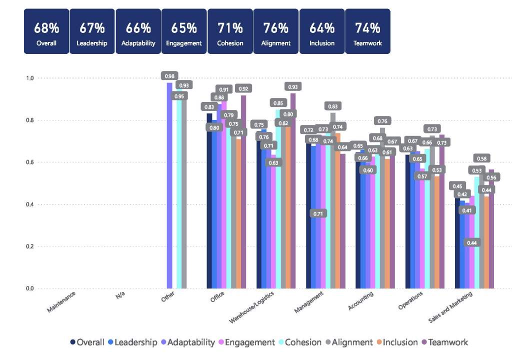 The chart above shows the responses of the entire company to the 10 Engagement questions. At the top level, things look good. However, some departments will be doing better than others, masking the potential issues that can seriously impact performance.