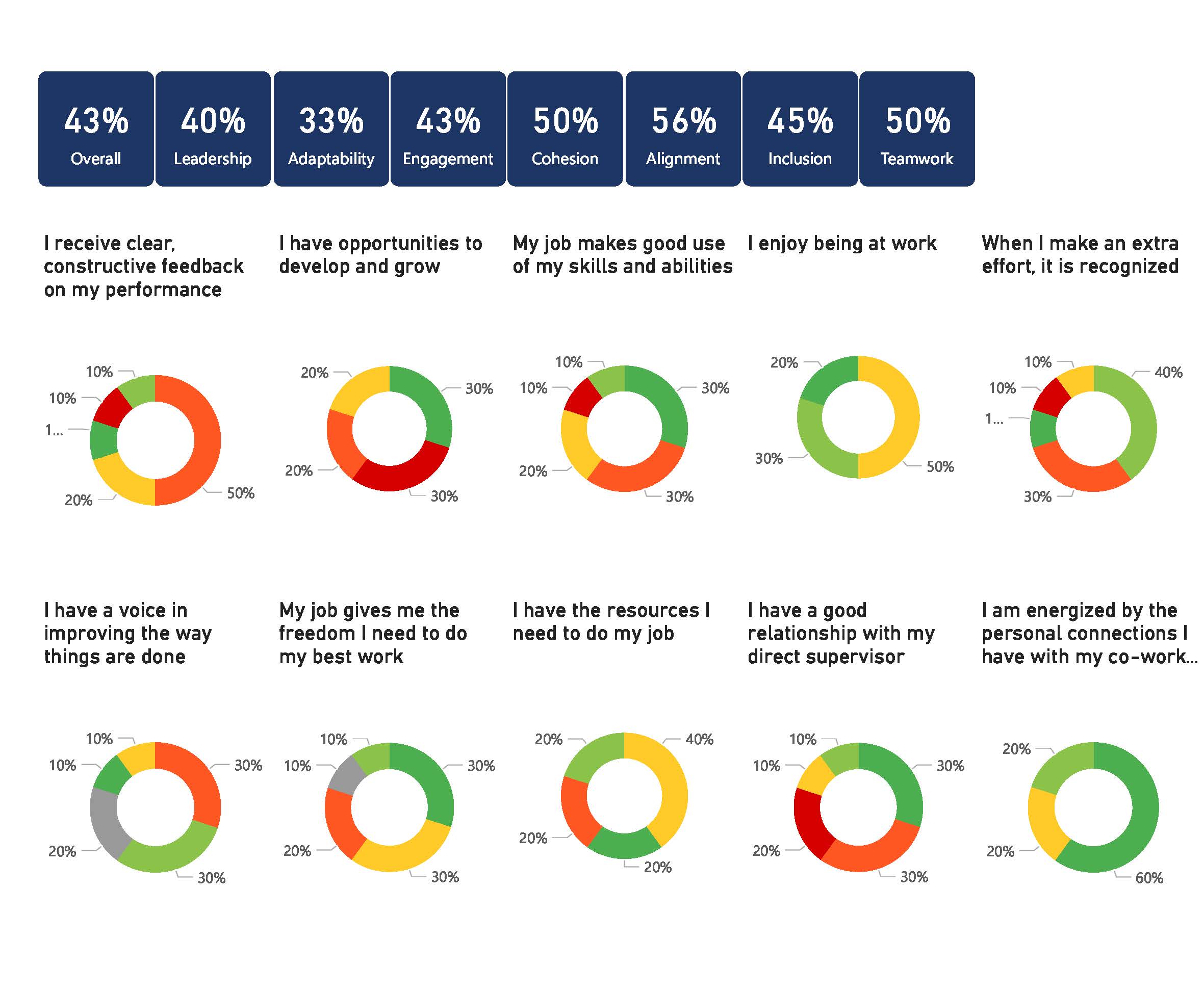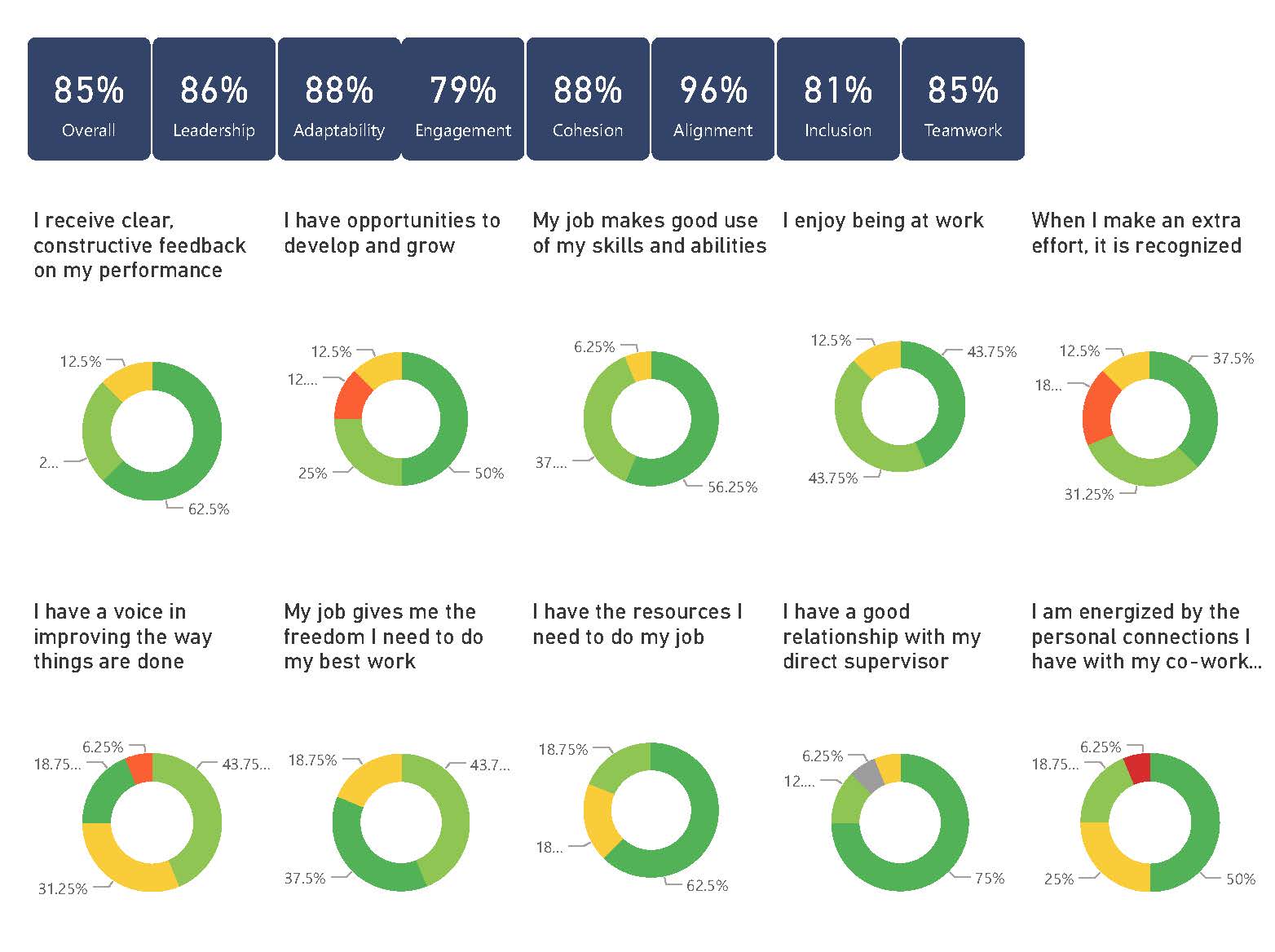 The chart above shows the responses of the entire company to the 10 Engagement questions. At the top level, things look good. However, some departments will be doing better than others, masking the potential issues that can seriously impact performance.